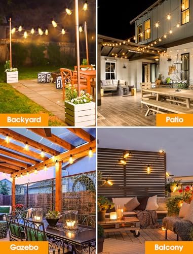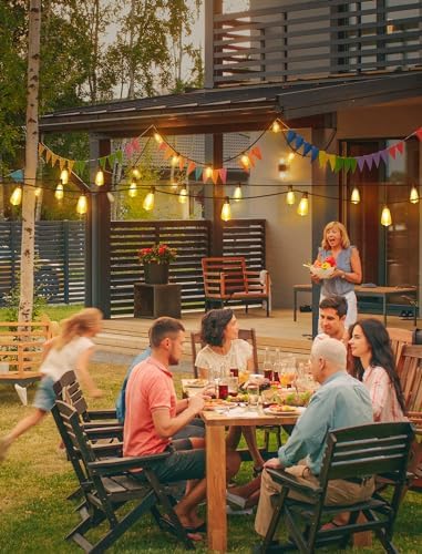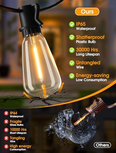 IP65 Waterproof Outdoor Patio Lights: Our led shatterproof bulbs are IP65 high-rated weatherproof to withstand heavy rain, humidity, heat and windy weather. Lightweight and storable, perfect for a variety of settings. Even on rainy days, you can enjoy our light strings without taking them back. Safer to use than glass bulbs without worrying about glass shards. Whether it’s a a birthday party, family gathering, or a romantic dinner to create a pleasant atmosphere, our lights have got you covered