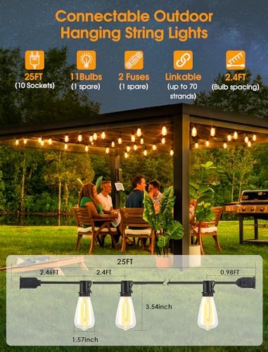 Easy Installation & Connectable Hanging Lights: The clips built into each bulb socket are perfect for hanging onto the wire ropes, no zip ties needed. Install and enjoy these beautiful lights in minutes, not as heavy as commercial-grade style wiring harnesses lights, our lights are lightweight and easy to untangled and hang, won’t sag easily. You can customize these lights to enjoy a great lighting atmosphere. This 25 ft string light can be connected up to 70 strands to cover a large space