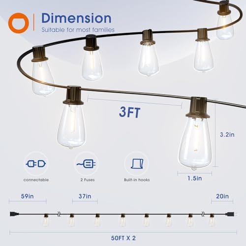【Connectable&Widely Used】the 100 FT (2*50FT)patio lights with end-to-end connection,you can easily connect up to 28 strands of 50FT, covering a larger area without worrying about length or frequent replacement.These outdoor lighting are widely used for various applications, including patio, backyard, bistro,pool,garden,gazebo,wedding, birthday, party or other scenarios .these string lights for outside can transform any setting into a magical and inviting atmosphere