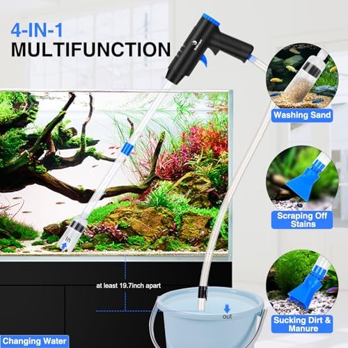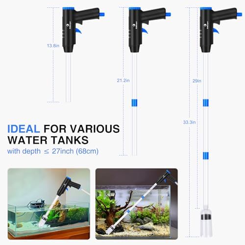 ????????ã€LENGHT ADJUSTABLE 】This aquarium cleaner with 3 extensions inlet rigid tubes, gives you extended reach to easily clear deep and narrow areas. The length of aquarium cleaner vacuum can be adjusted according to your different fish tank sizes, perfect for small/larger freshwater/saltwater tanks (depth ≤ 27″). Suitable for all substrates (sand, gravel, plant).
