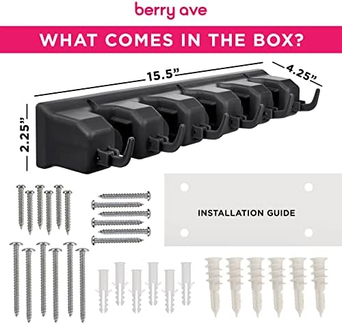Berry Ave Broom Holder & Wall Mount Garden Tool Organizer – Home Laundry Room, Kitchen, Closet, Shed, Garage Organization and Storage Utility Rack – 5 Slots & 6 Hooks -Rake, Shovel, Mop Hanger (Black)