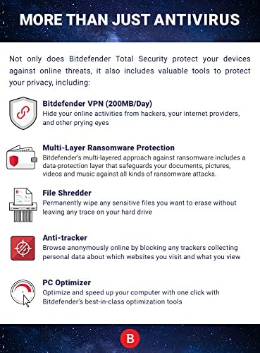 Also includes: Real-Time Data Protection, Network Threat Prevention, Multi-Layer Ransomware Protection, Social Network Protection, Webcam Protection, Game/Movie/Work Modes, Anti-Phishing, Anti-Fraud, Anti-Spam, Rescue Mode, Bitdefender VPN (200 MB/day), File Encryption, Password Manager, File Shredder, Vulnerability Assessment, Security Autopilot, and much more