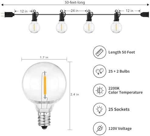 【 IP44 Waterproof String Lights 】- With upgraded waterproof grade, these decorative lights will normally work all year round, whether it is raining, snowing, or humid weather. It will not cause any damage to these outdoor string lights. For G40 led replacement bulbs,please search B07DN94P21