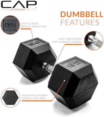 The CAP 10 LB Coated Hex Dumbbell Weight, New Edition has been updated with robust packaging to ensure your dumbbell gets to you in great condition! Our dumbbell ends are made from ASTM A48 Class 20 grey iron with a durable coating and joined together by a solid 1018 cold rolled steel chromed handle, providing a strong, durable product that will last for years to come. Dumbbells are used to target all major muscle groups, including arms, chest, back, abs, legs and core – so they are essential for any home gym! The CAP Coated Hex Dumbbell Weight offers many benefits when incorporated in exercise routines, which includes muscle building, improving core strength, boosting balance, providing better bone health, burning calories, increasing energy levels, enhancing overall mood and more. Use your CAP Coated Hex Dumbbell for essentially any exercise routine such as isolations, full body, functional, conditional, strength training, and HIIT workouts. Includes 30-day manufacturer warranty.