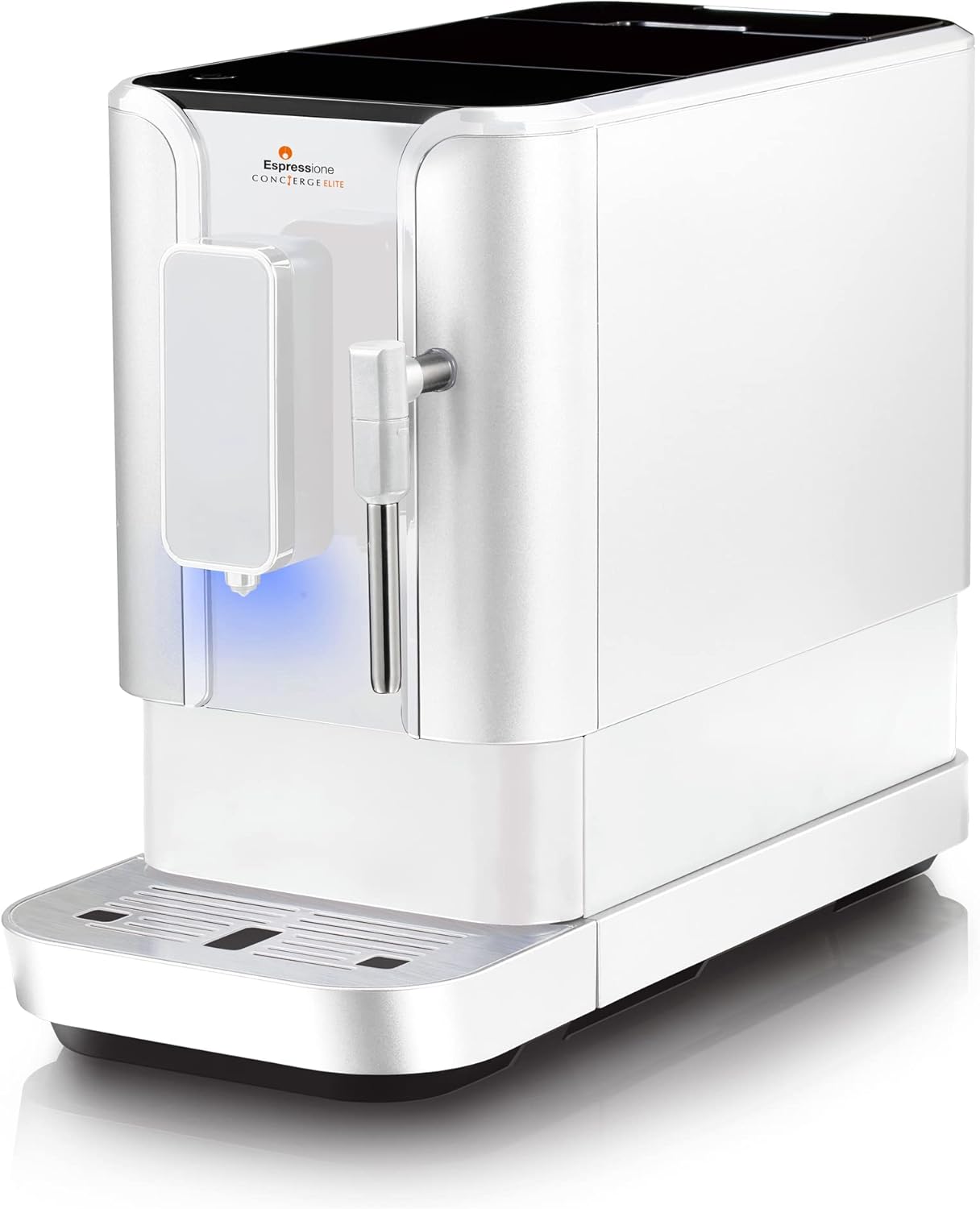 THIN, FAST & EASY Espressione Concierge Elite fully automatic Bean to Cup espresso machine will brew barista-quality espresso drinks effortlessly with a simple touch of a button. Exceptionally compact THIN profile – with a width of only 7 inches (180 mm) the machine allows you to place it in your home office, kitchen or any convenient place. Astonishingly FAST thermoblock heating system-first drop of coffee appears approximately 22 seconds from standby position. High-performance 20-bar pump provides balanced extraction. Stainless-steel conical grinder has adjustable settings. 400-gram coffee bean hopper has airtight seal that keeps beans fresh. Incredibly EASY to use LED Control Panel with elegant Cobalt Blue display icons. One touch keys for your favorite coffees : Espresso, Lungo and Ristretto. Adjustable coffee spout fits variety of cup sizes. Steam Nozzle for Frothing Milk is adjustable to create the perfect cappuccino or macchiato. Express Yourself by enjoying your favorite espresso beverage in a beautifully smart and solid performing fully automatic espresso machine, without the need for SmartHQ or other apps in two amazing options, Concierge Elite Infinite Black or Concierge Elite Diamond White!