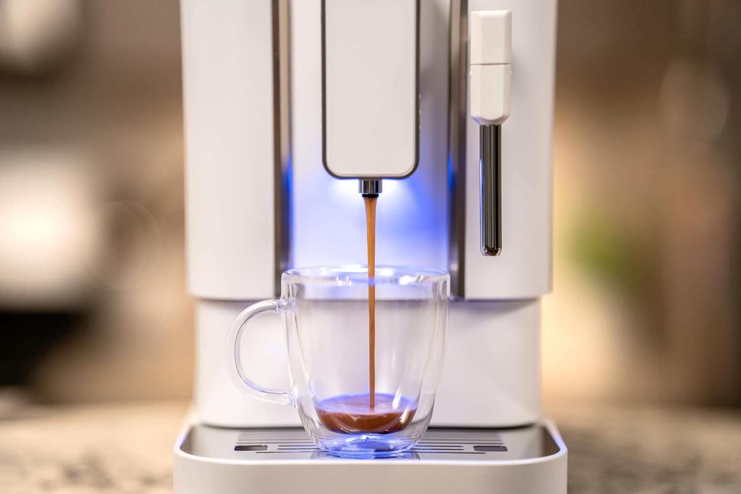 Beautiful and space efficient design in an embossed steel brushed body with elegant Cobalt Blue lighting during brewing and frothing and hot water operations