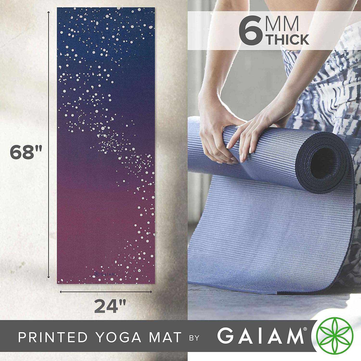Extra-thick Premium Print Yoga Mats provide a stable, sticky, non-slip 5/6mm cushioned surface for your yoga practice. Perfect for home or studio use, this mat ensures the safety and comfort you need to enhance proper alignment and maintain poses and the additional cushioning helps to protect joints. Manufactured free of the top six most harmful phthalates, this mat is a healthier choice for both you and the planet! Please note a packaging change from 5mm or 6mm, but rest assured it is the same size and style mat, just in new and improved packaging. Also, printed yoga mats may release a harmless odor when first unwrapped. For best results unroll and air out your mat for 2-3 days before use.