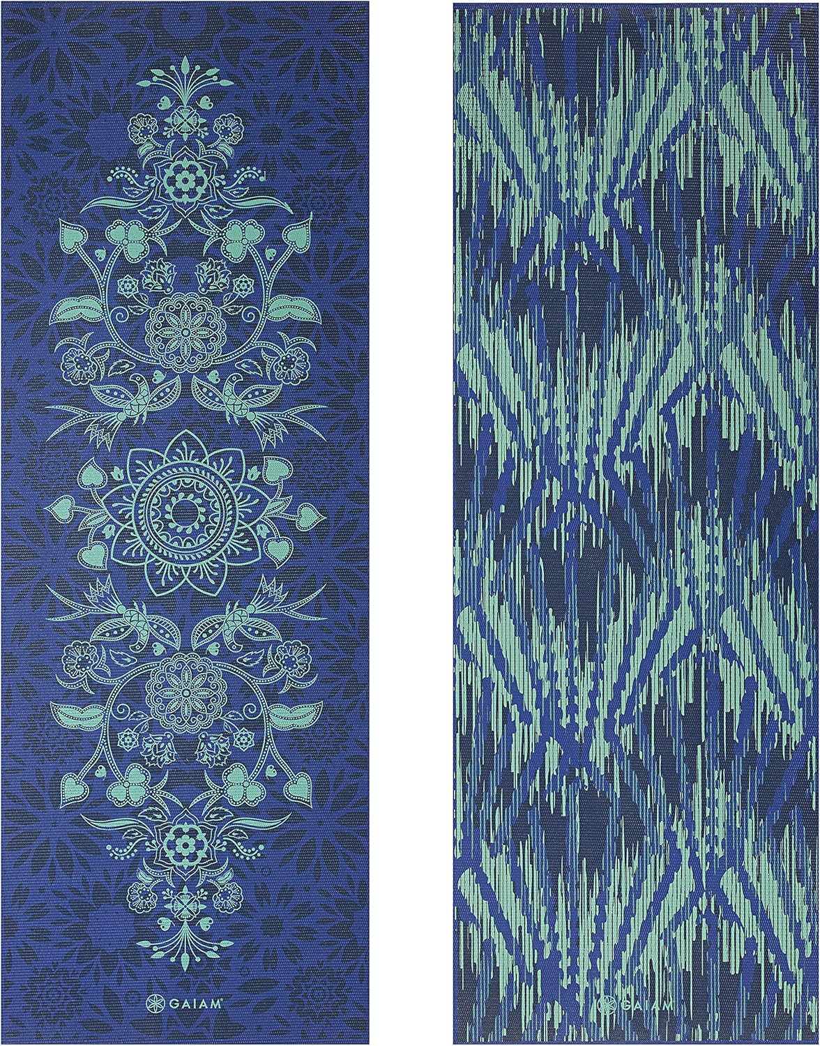 Durable and chic, Gaiam’s Premium Print Reversible Yoga Mats provide a stable, sticky, non-slip 5/6mm cushioned surface for your yoga practice. Perfect for home or studio use, this mat ensures the safety and comfort you need to enhance proper alignment and maintain poses and the additional cushioning helps to protect joints. Manufactured free of the top six most harmful phthalates, this mat is a healthier choice for both you and the planet! Please note a packaging change from 5mm or 6mm, but rest assured it is the same size and style mat, just in new and improved packaging. Also, printed yoga mats may release a harmless odor when first unwrapped. For best results unroll and air out your mat for 2-3 days before use. Manufactured free of the top six most harmful phthalates, this mat is a healthier choice for both you and the planet! Please note that printed yoga mats may release a harmless odor when first unwrapped.
