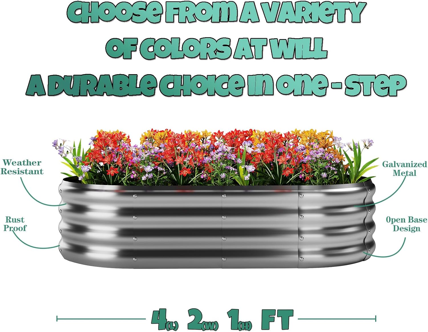 Outdoor galvanized planter boxes size: 4×2×1 ft, Can hold garden soil and fertilizers: 7.14 Cubic feet. Available in a variety of colors, you can choose the one that best suits your garden style. Moreover, you can use galvanized sheets to splice out the size and shape you want. Use your design skills and imagination, and combine this galvanized garden beds outdoor with metal plant stakes to DIY your beautiful garden