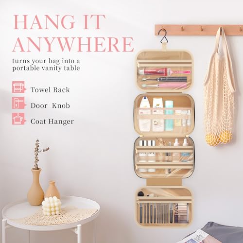 STURDY HOOK DESIGN: Featuring a premium metal hook, the HOTOR cosmetic travel bag offers the convenience of hanging from a towel rack, coat hook, or any available space. This not only showcases your toiletries and cosmetics for easy accessibility but also saves valuable bathroom counter space. The sturdy metal hook is designed with a retractable feature, allowing it to be neatly stowed away when not in use.