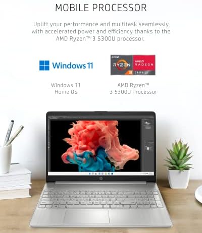 The HP 15 Laptop is designed to keep you productive and entertained from anywhere. Take your 15.6-inch laptop wherever you go and see more of your entertainment on an HD, micro-edge display (1). Not only do your games and movies look better, but with the AMD Radeonâ„¢ Graphics card, everything you do gets a performance boost (2). The AMD Ryzen 3 5300U Mobile Processor accelerates your power and efficiency, keeping you productive wherever your work takes you (3). Out-class traditional hard drives with 256 GB of PCIe NVMe M.2 SSD storage and experience improved multitasking with higher bandwidth thanks to 8 GB of RAM (4). This laptop computer gives you reliable power all day with 7 hours and 15 minutes of battery life (5). Plus, HP Fast Charge gets you from 0 to 50% charge in approximately 45 minutes to get you back up and running in a pinch (6). Enjoy fast and reliable internet connections with the Wi-Fi 6 (2×2) and Bluetooth 5.0 combo (8) (9). Work or learn remotely with MU-MIMO support for smoother Wi-Fi in multi-device homes, a full-sized keyboard, an HD web-camera (12), and the familiar feel of the Windows 10 Home operating system (7). Beyond the familiar feel, your laptop is also set for some improvements thanks to the guaranteed free upgrade to Windows 11 when available (8). Stay environmentally responsible with an ENERGY STAR certified (13), EPEAT Silver registered (14), and low halogen (15) Windows 10 laptop. Get right to work and your entertainment with a laptop backed by a 1-year limited hardware warranty. (1) High-definition (HD) content is required to view high-definition images. (2) Shared video memory (UMA) uses part of the total system memory for video performance. System memory dedicated to video performance is not available for other use by other programs. (3) Multi-core is designed to improve performance of certain software products. Not all customers or software applications will necessarily benefit from the use of this technology. Performance and clock frequency will vary depending on the application workload and your hardware and software configurations. AMD’s numbering is not a measurement of clock speed. AMD and Radeon are trademarks of Advanced Micro Devices, Inc. (4) Actual formatted capacity is less. A portion of internal storage is reserved for preloaded content. Based on HP internal testing using CrystalDiskMark benchmarking software. Performance is sequentially faster (read-only) compared to traditional 5,400 rpm HDD. (5) Windows 10 MobileMark 18 battery life will vary depending on various factors including product model, configuration, loaded applications, features, use, wireless functionality, and power management settings. The maximum capacity of the battery will naturally decrease with time and usage. See bapco.com/products/mobilemark-2018/ for additional details. (6) Based on HP internal testing using CrystalDiskMark benchmarking software. Performance is sequentially faster (read-only) compared to traditional 5,400 rpm HDD. (7) Not all features are available in all editions or versions of Windows. Systems may require upgraded and/or separately purchased hardware, drivers, software, or BIOS update to take full advantage of Windows functionality. Windows 10 is automatically updated, which is always enabled. ISP fees may apply and additional requirements may apply over time for updates. See microsoft.com (8) Wireless access point and internet service required and sold separately. Availability of public wireless access points limited. Wi-Fi 6 (802.11ax) is backwards compatible with prior 802.11 specs. The specifications for Wi-Fi 6 are draft and are not final. If the final specifications differ from the draft specifications, it may affect the ability of the notebook to communicate with other Wi-Fi 6 devices. Only available in countries where 802.11ax is supported. (9) Bluetooth is a trademark owned by its proprietor and used by Hewlett-Packard Company under license. (10) Based on Wi-Fi 5 80MHz and Wi-Fi 6 160MHz minimum requirements when transferring files between two devices connected to the same router. Requires a wireless router, sold separately, that supports 802.11ax (Wi-Fi 6). Only available in countries where 802.11ax is supported. (11) Wi-Fi supporting gigabit speeds is achievable when transferring files between two devices connected to the same router. Requires a wireless router, sold separately, that supports 160MHz channels. (12) Features may require software or other 3rd party applications to provide the described functionality. Internet service required and not included. (13) ENERGY STAR and the ENERGY STAR mark are registered trademarks owned by the U.S. Environmental Protection Agency. (14) Based on U.S. EPEAT registration according to IEEE 1680.1-2018 EPEAT. EPEAT status varies by country. Visit www.epeat.net for more information. (15) External power supplies, power cords, cables, and peripherals are not Low Halogen. Service parts obtained after purchase may not be Low Halogen.