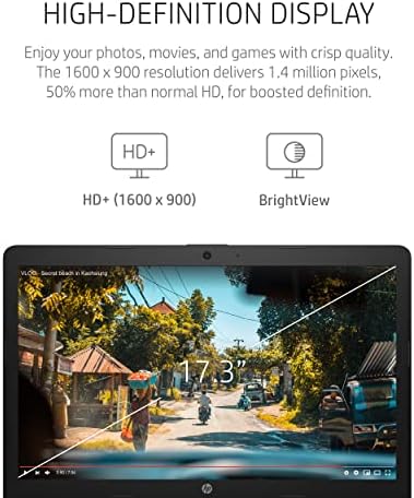 HD PLUS DISPLAY – View all your photos, movies, and games in crisp HD Plus (1600 x 900) resolution on a narrow-edge, 17.3-inch diagonal display (1). Plus, the BrightView glossy finish means on-screen colors pop while blacks appear deep and distinct.