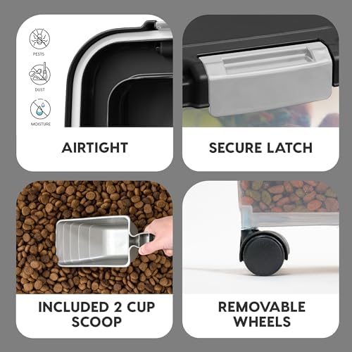 CONTENTS: 11 lbs / 12 Qt storage container securely stacks on the 30 lbs / 33 Qt storage container, one matching 2-cup food scoop, and one set of wheels. Included scoop makes measuring food easy and attachable casters make it easy to roll it around.