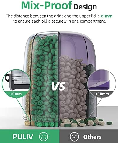 Say Goodbye to Mixing Pills: PULIV jumbo medication organizer with the design that the distance between the grids and the upper lid is close to ensure anti-mixing pills. Stop being troubled by pills mixing when pouring.