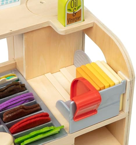 Create piled-high sandwiches, made to order with this wooden sandwich counter play set with all the fixin’s! The sturdy wooden deli counter includes a play meat and cheese slicer for the wooden play food, and felt sandwich roll and toppings to create sandwiches ordered from the menu. There is a wooden dressing bottle, play snacks, and a cup with drink insert to round out meals that customers can pay for with the included play money! An illustrated guide helps with sandwich prep and shows kids how to use the slicer. All 52 pieces store in the sandwich counter for easy cleanup. It’s a deliciously fun way to encourage counting, sorting, and fine motor skills, as well as imaginative play and storytelling. For more than 30 years, Melissa & Doug has created beautifully designed imagination- and creativity-sparking products that NBC News called “the gold standard in early childhood play.” Today, Melissa & Doug is proudly partnering with the American Academy of Pediatrics to foster early brain development and help children build important life skills through play.