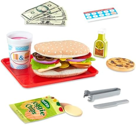 Play food includes wooden meat and cheese slices, felt toppings and sandwich roll, wooden dressing bottle, play chips, cookie, and drink cup with insert; play money included