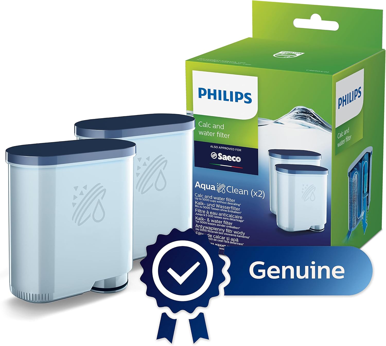 PHILIPS AquaClean Original Calc and Water Filter, No Descaling up to 5,000 cups, Reduces Formation of Limescale, 2 AquaClean Filters, (CA6903/22)