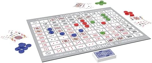 Includes 1 Folding Game Board (19.75″ x 15.25″), 2 Decks of SEQUENCE Playing Cards (2.25″ x 3.5″), 135 Playing Chips (50 Green, 50 Blue, 35 Red), and Complete Instructions