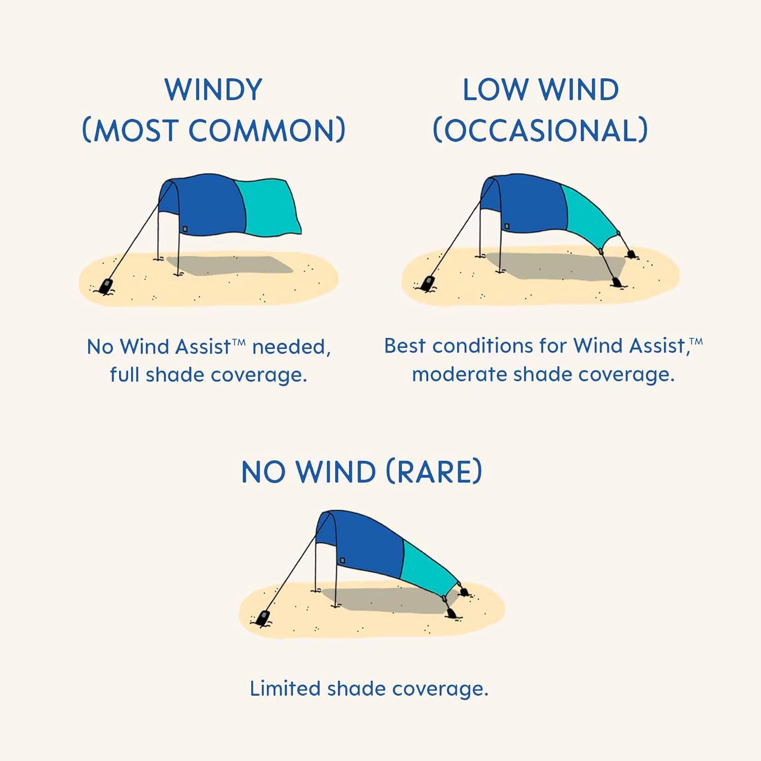 “WIND ASSIST TECHNOLOGY INCLUDED: No wind? No problem. The included Shibumi Wind Assist accessory attaches to the canopy corners with sandbags, creating a stable, tent-like shape for reliable sun shade even on low-breeze days.”