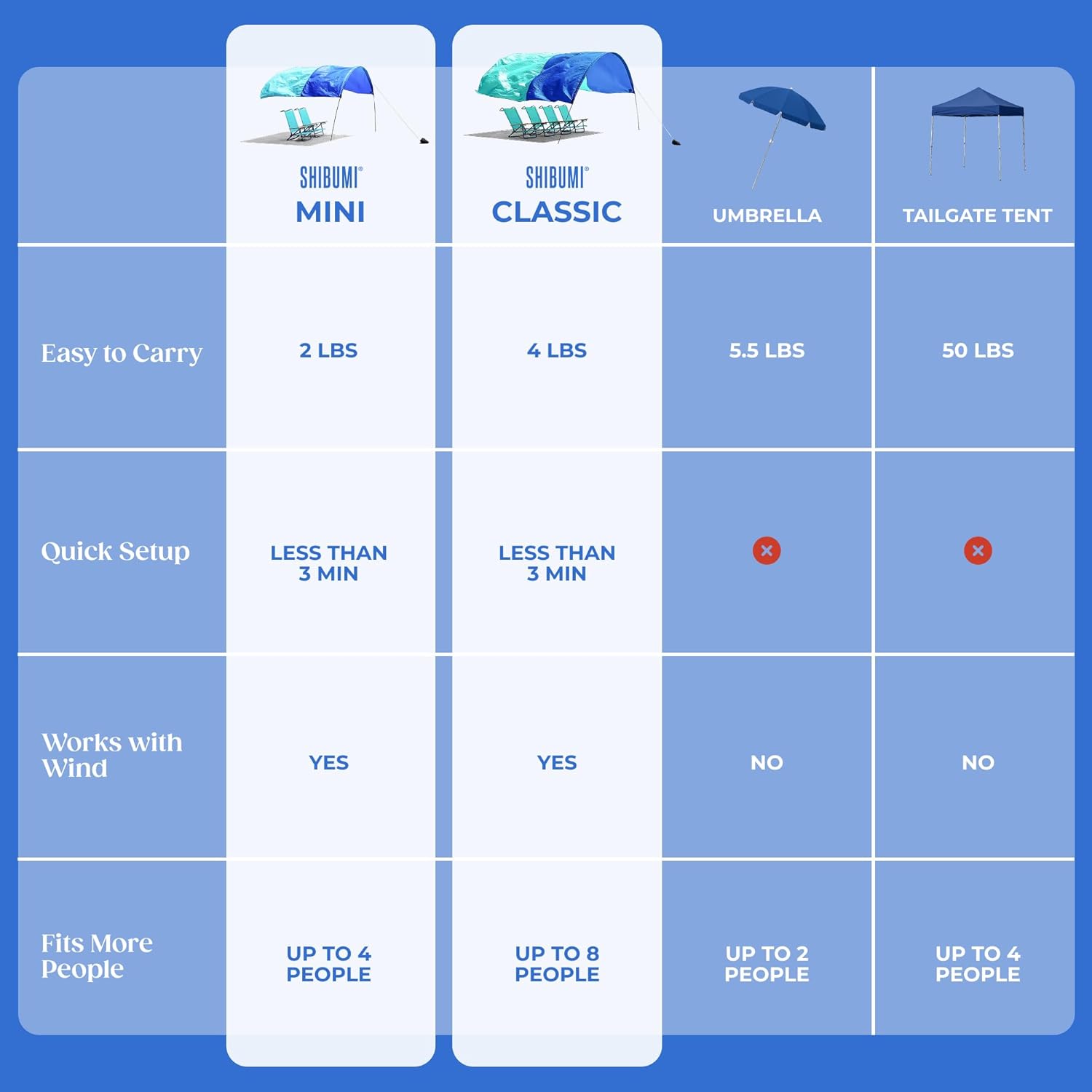 At just over four pounds, Shibumi Shade packs into a carry-on-sized bag, making it easy for flights, road trips, and beach vacations.