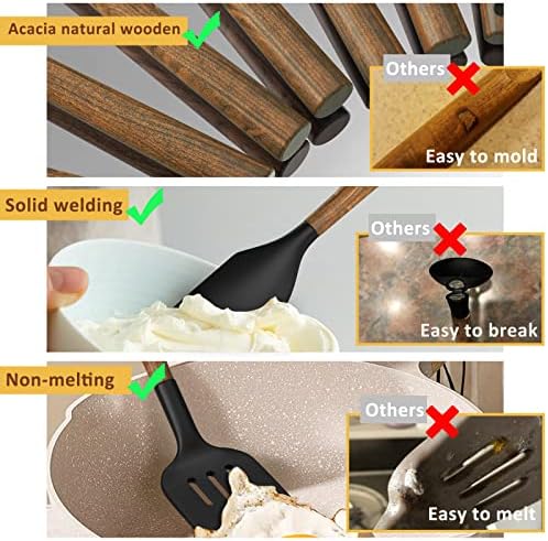 ????????HIGH TEMPERATURE WITHSTAND — Our Silicone spatulas can withstand high temperatures up to 446°F/230°C. All-around silicone added to the softness, no longer worry food will stick your cookware or produce smells. Silicone head protect your pans. They are scratch resistant, unlike plastic and rubber utensils that will easily melt or metal kitchen utensils harm your nonstick pots. NOTE: The texture of each wooden handle is slightly different