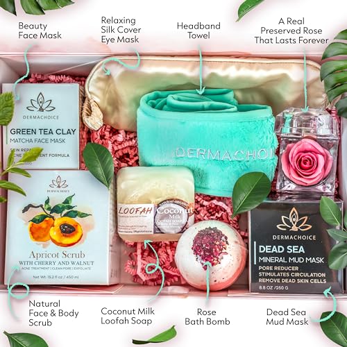 Total Spa Experience at Home – Our spa gift box comes complete with a green tea and dead sea mud mask, cherry walnut scrub, coconut milk soap, spa headband, rose bath bomb, silk eye cover, and a preserved rose.
