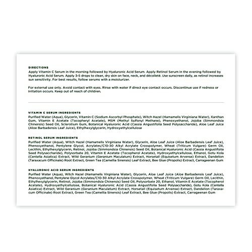 INSTRUCTIONS: Apply Vitamin C Serum in the morning followed by Hyaluronic Acid Serum. Apply Retinol Serum in the evening followed by Hyaluronic Acid Serum. Apply 3-5 drops to clean, dry skin on face, neck, and décolleté. Use sunscreen daily, as retinol increase sun sensitivity. For best results, follow serums with a moisturizer.