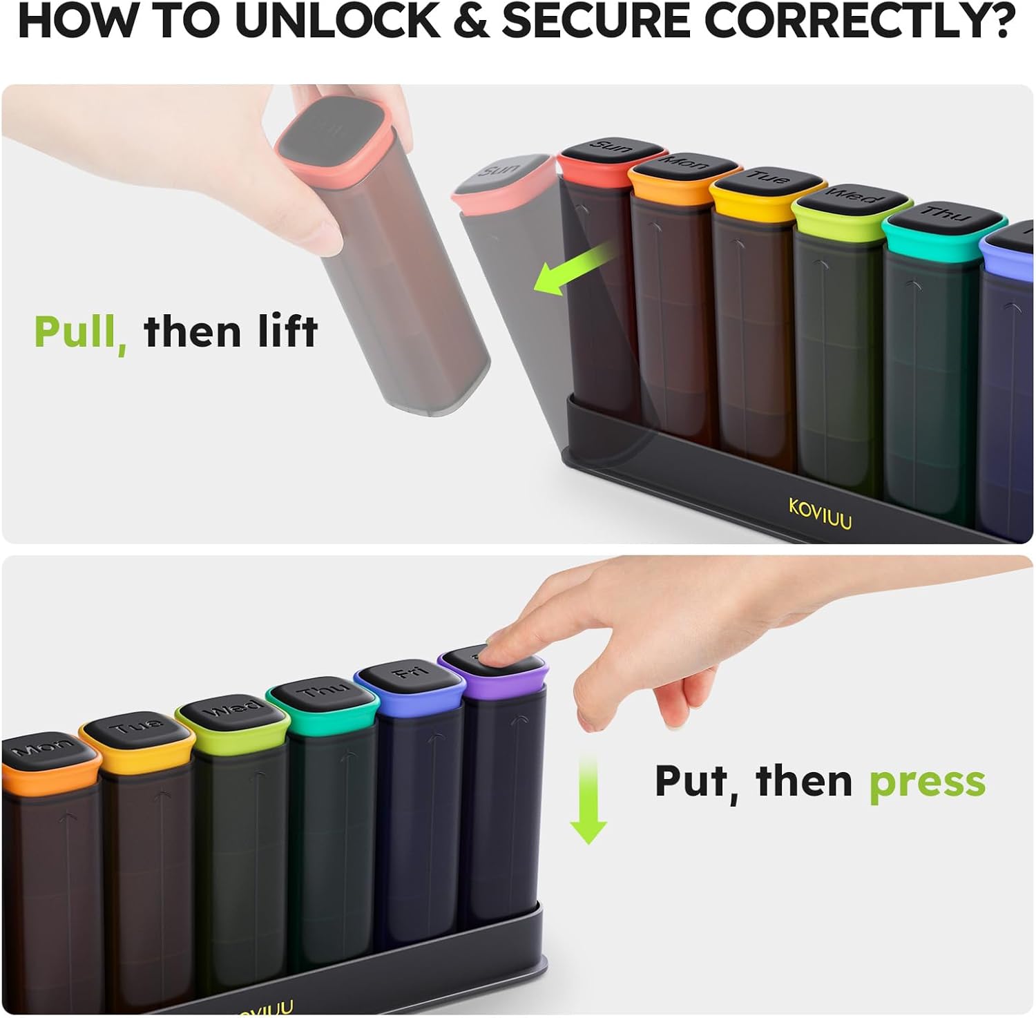 Drawer Design: KOVIUU newly presents a drawer-style pill organizer 7 day that stays securely closed once shut, ensuring pills do not spill out in pockets & bags while you can easily pull out the inner tube to access your pills