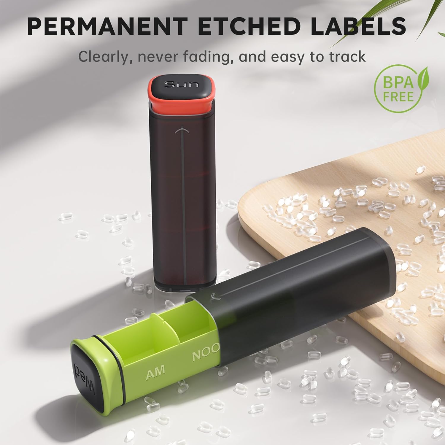 Easy to Track: The letters on the portable medicine box use intaglio technology, and stay clear and distinct forever. Days of the week and times are labeled on the top and inside, helping you track your pills and reminding you to take them on time