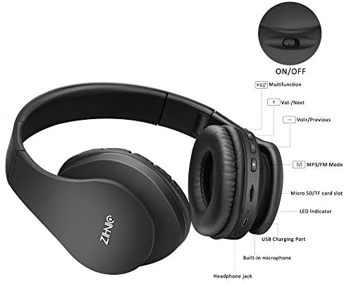 ZIHNIC Bluetooth Headphones Over-Ear, Foldable Wireless and Wired Stereo Headset Micro SD/TF, FM for Cell Phone,PC,Soft Earmuffs &Light Weight for Prolonged Wearing (Black)