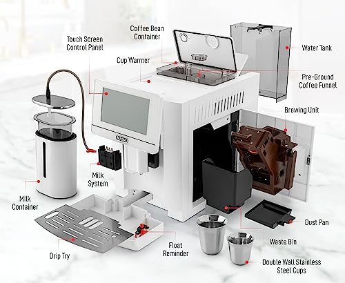 FULLY CUSTOMIZABLE: Enjoy coffee the way you love with super simple customizations on with our large HD touch-screen. Easily adjust coffee strength, temperature, milk and water volume and more. With 10 fully customizable user profiles, just save your settings for the perfect cup every time. This espresso maker also comes with a 1.8L water tank, 19 bar Italian pump, a cup warmer plate, 2 deluxe cups, an adjustable coffee spout, and a double-brewing function.